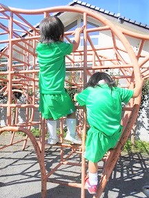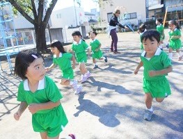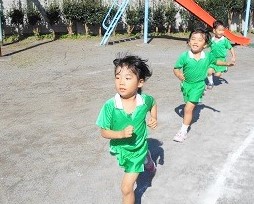 園庭のタイヤ跳び箱で跳び箱の基礎をしっかりと練習し、