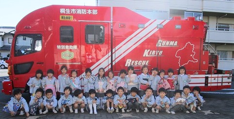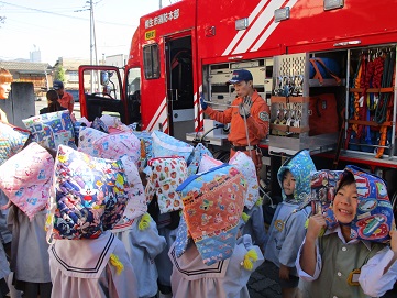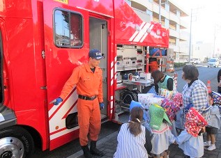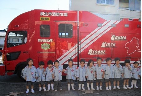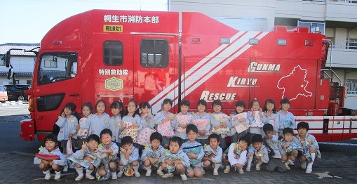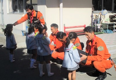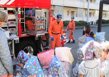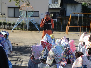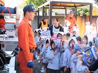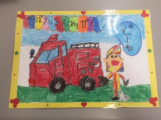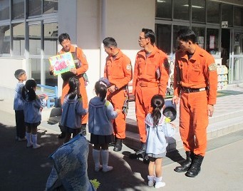 最後に消防隊の方々に年長さんが描いた絵とメダルをプレゼントして