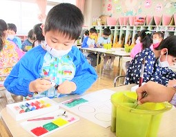 今日の月組さんは「構成あそび」という絵の具と製作帳の合体遊びを行いました。