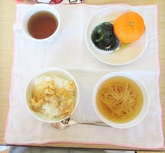 ・親子丼 ・そうめんのすまし汁 ・きゅうりとわかめの酢の物 ・みかん
