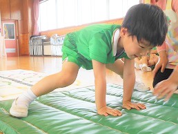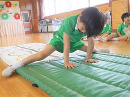 そしてタンブリン隊の基礎練習をした後、お遊戯室で前転の練習を行いました。