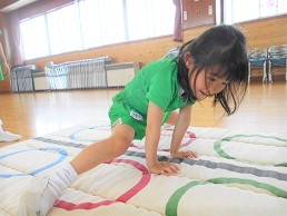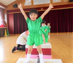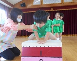 お遊戯室で跳び箱の練習をしました。