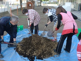 植木鉢に職員で土入れをしました。