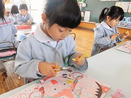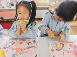半分に折った色紙を線に沿って はさみで切っていきます。