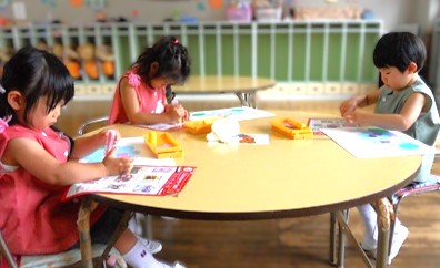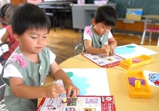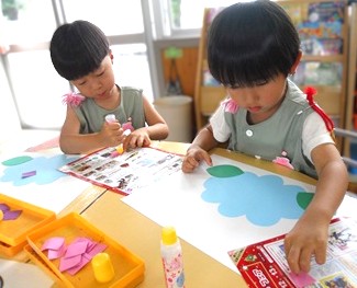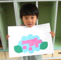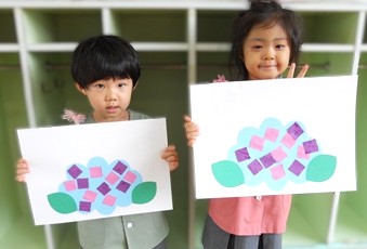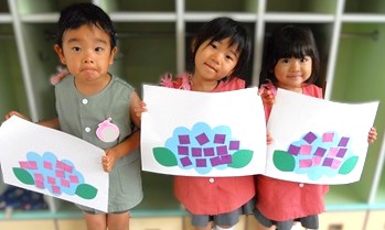 火曜日に、はさみで切った色画用紙を今日はアジサイに糊付けしていきます。