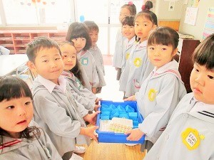 年長つき組さんが、豆まきの箱を地道に作り、