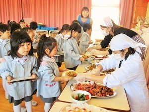 パーティーは、お皿を持ちお給食を自分でいただきに行きました。