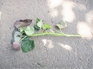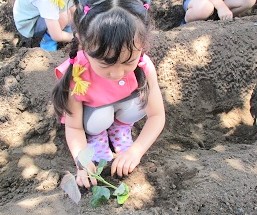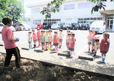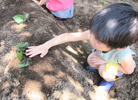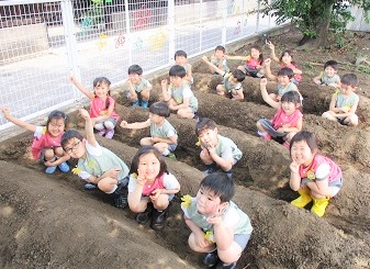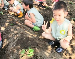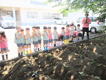 年長月組さんが駐車場の畑にさつまいもの苗植えをしました。