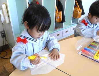つぼみ組さんが、お正月遊びの「たこ」を作り始めました。