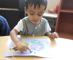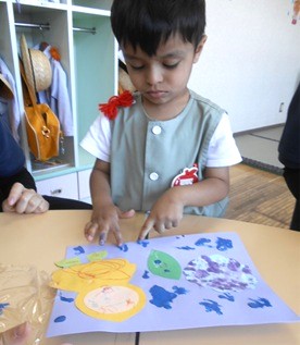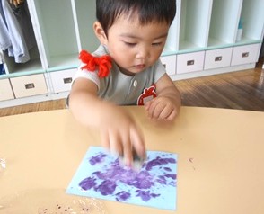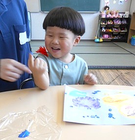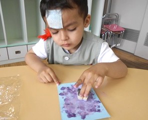 先日、スポンジを使って絵の具をスタンプしたつぼみ組さん。