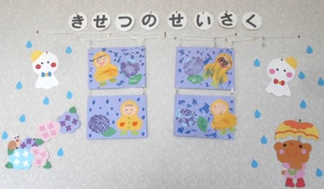 雨が降り、レインコートを着ながらアジサイを見ている「梅雨」のせいさくが完成しました。
