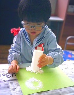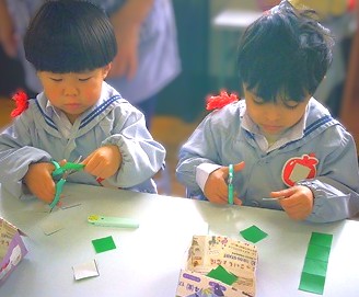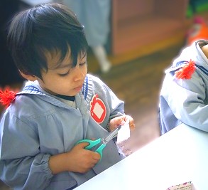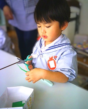 その後は、はさみを使って緑色の折り紙を切っていきます。