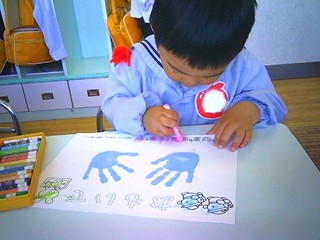 かわいい手形を押した画用紙。
