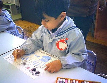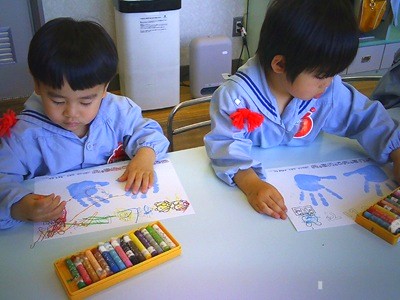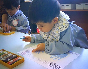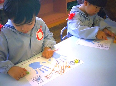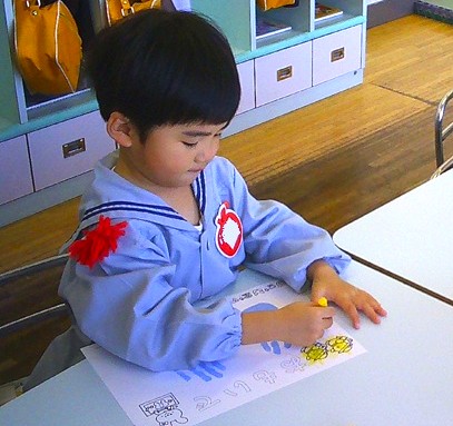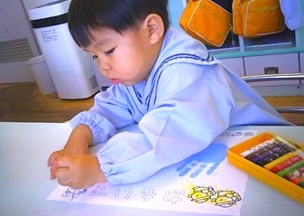 今日は、その表紙の回りをクレヨンで色塗りをしました。