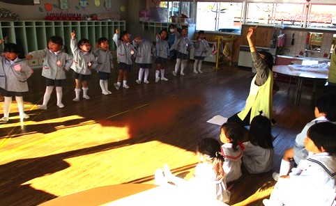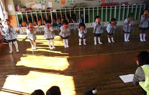 つぼみ組さんと花組さんが、クリスマス会の練習をお互いに見せ合うミニ発表会を行いました。