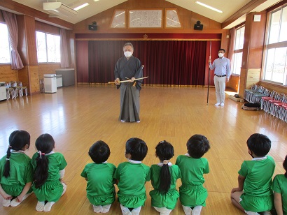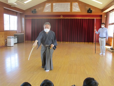 そして特別に舞台で使用する薙刀と刀を使い、「船弁慶」の名場面を見せてくださいました。