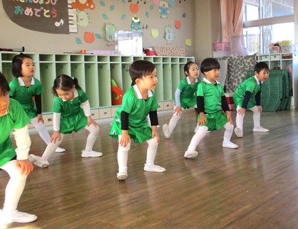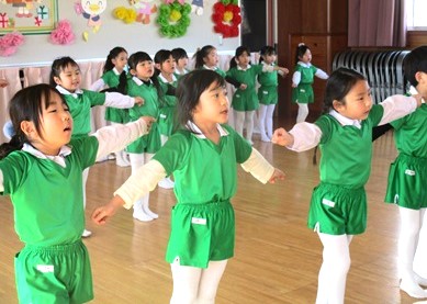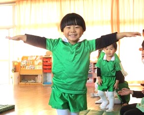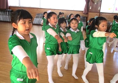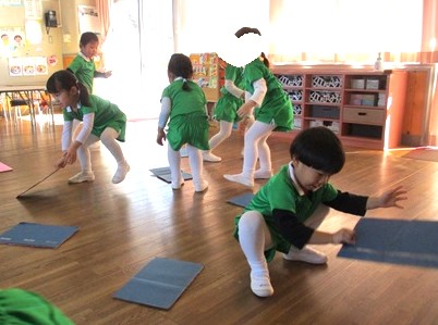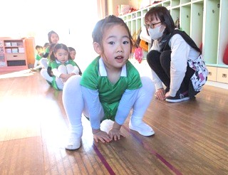 園庭がドロドロだったため、各クラスで体操して