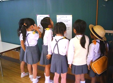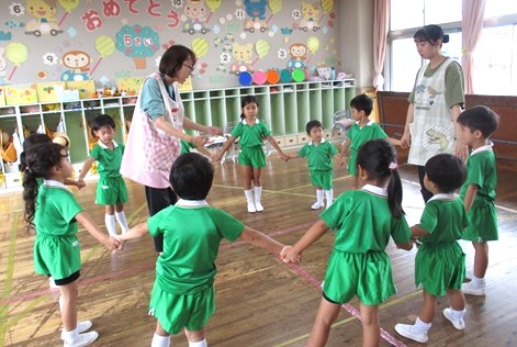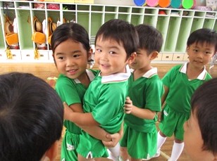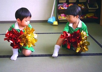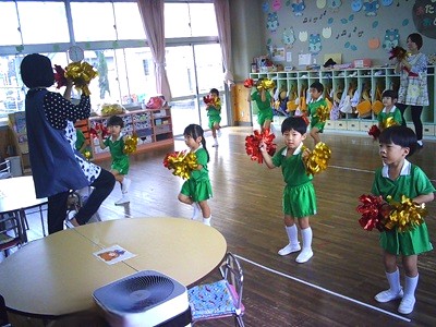 園歌のお遊戯練習では、つぼみ組さんが雪組さんの教室に遊びに行って一緒に踊りました。