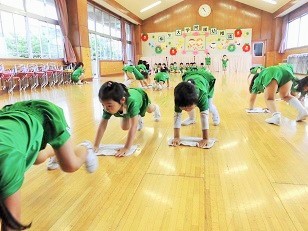 雪組さんは雑巾がけをして、腕の力と足の指先の力を強化しています!