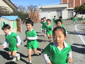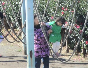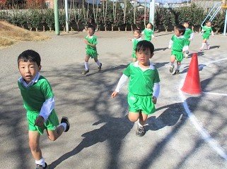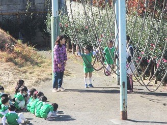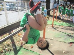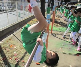 月組さんは、球拾いの後、鉄棒で前回りの練習です。