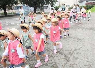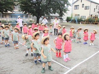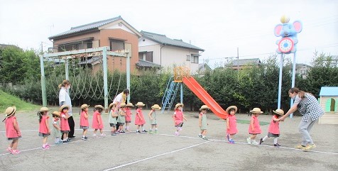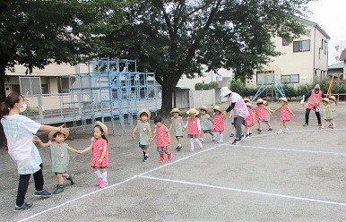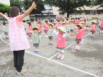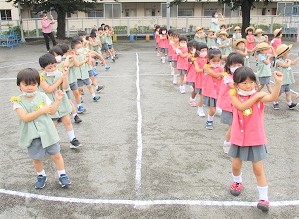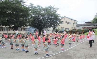 園庭のトラックを行進し、みんなでディズニー体操を踊っています。