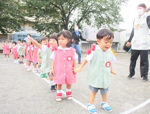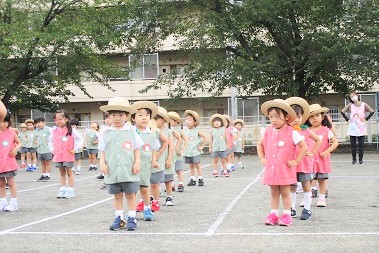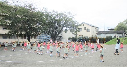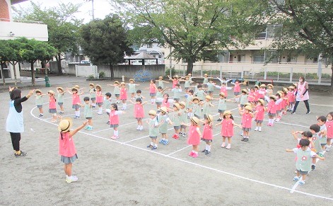 暑い園庭での体操は熱中症対策でマスクを外して行います。