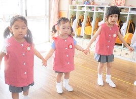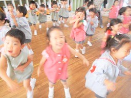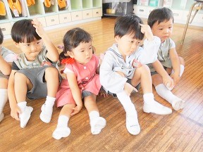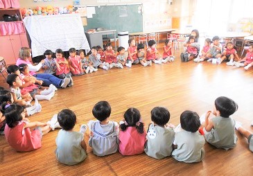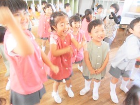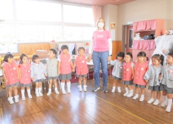 大きなクラスの友達を見ながら、進級や英語への期待を膨らませたつぼみ組さん。