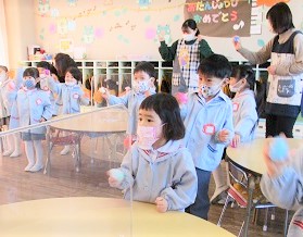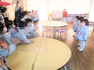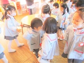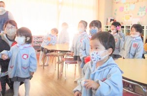 大きなクラスの友達を見ながら、進級や英語への期待を膨らませたつぼみ組さん。