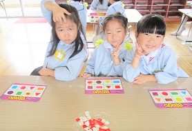 カードを英語で読み上げ、同じ色と形を探していきます。