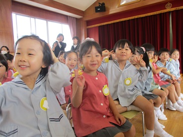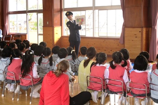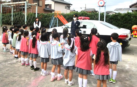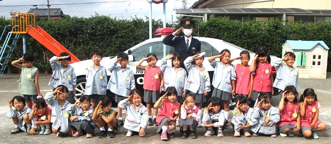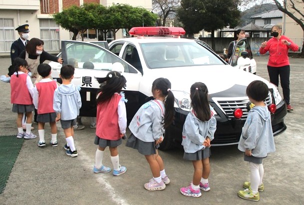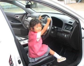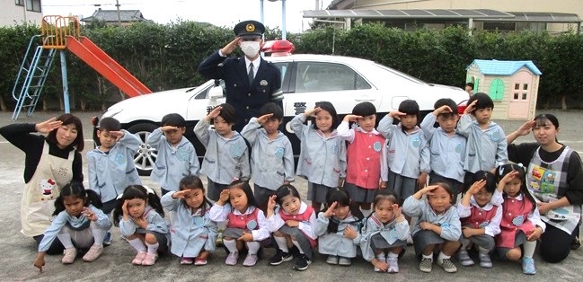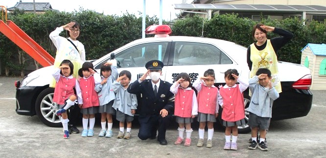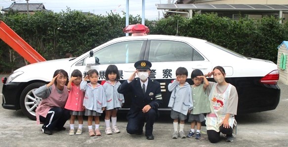 パトカーに乗せていただき、お巡りさんの気分を満喫して、みんなで記念撮影をしました。