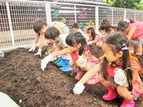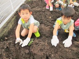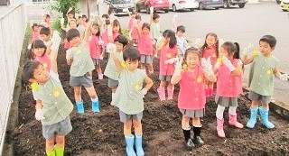 年長月組さんが駐車場の畑にさつまいもの苗植えをしました。