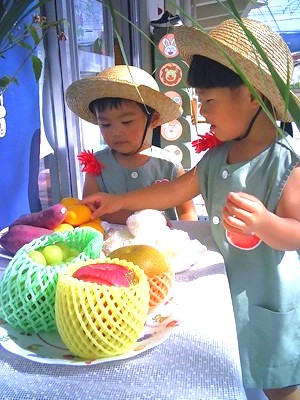おいしそうな果物やお団子を目の前に・・・