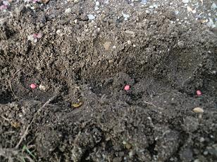 一列に並んで かわいい小さな赤い種をまきました。
