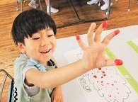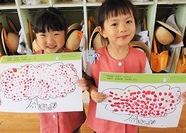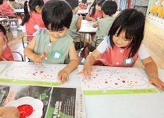 初めての絵の具遊びは楽しさいっぱい、洋服汚れいっぱい・・・(^^;)