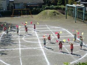 2色の旗を使って 隊形移動しながら踊ります。