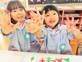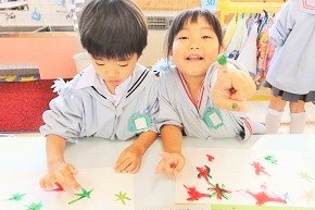 今日は、赤色と緑色の絵の具を使って遊びました♪