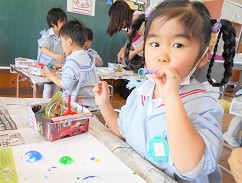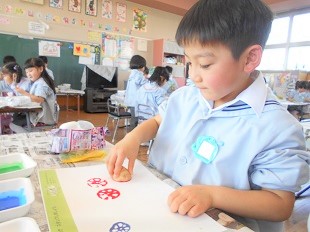 素材に絵の具を塗り、どんどんスタンプしていきます!
