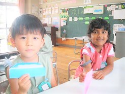 2両編成の電車を好きな色の折り紙で折っていきます。
