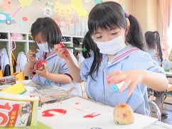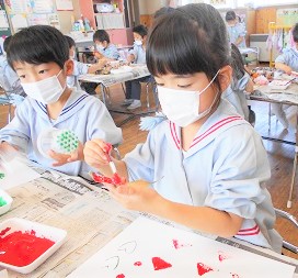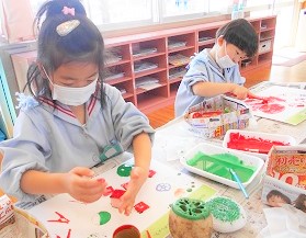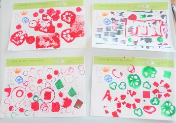 色々な形のものに絵の具を塗ってスタンプし、
