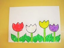 昨日、チューリップがたくさん咲いている画用紙に色を塗りました。