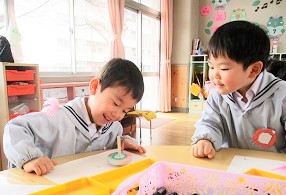 はな組さんのこまは両手で回す ≪手まわしこま≫ といいます。