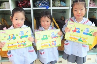枠に合わせてシールを貼り、乗り物を作り上げました。