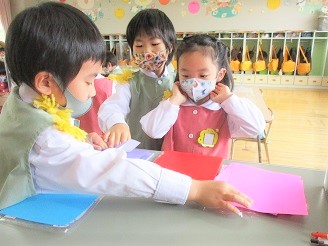 想像しながら好きな色を選んで 折り紙を折りました(^^)