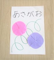 今日は朝顔観察ノートの表紙に飾る ≪あさがお≫を折り紙で作りました。