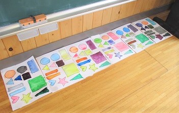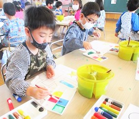 今日の月組さんは「構成あそび」という絵の具と製作帳の合体遊びを行いました。