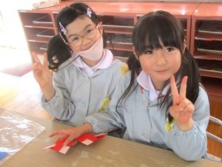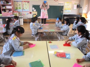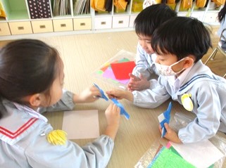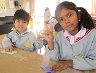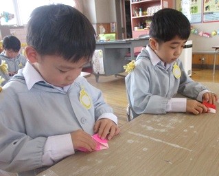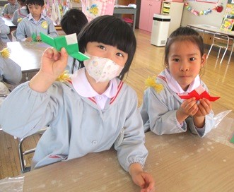 その前に、お雛様への興味を持ってもらおうと、折り紙でお雛様を折ってみました。