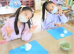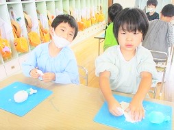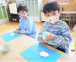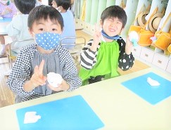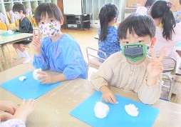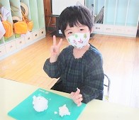 指人形の型に紙粘土をつけながら、自分の顔を作っていきました。