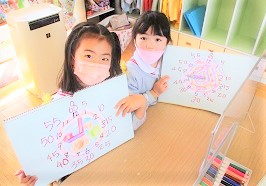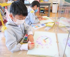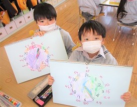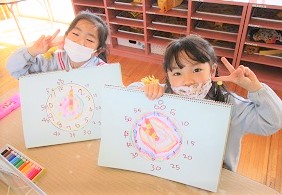 今日は、短い針の読みかたと長い針の読みかたをみんなで覚えて