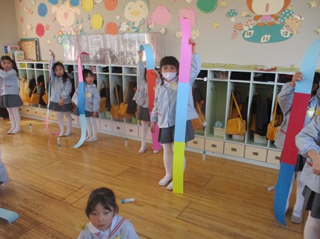 長い色画用紙で作るので、机の上に入りきらない!!