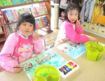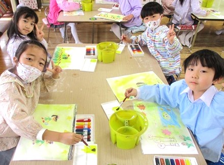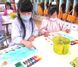 今まで描いた思い出画に、水彩絵の具を塗っていきます。